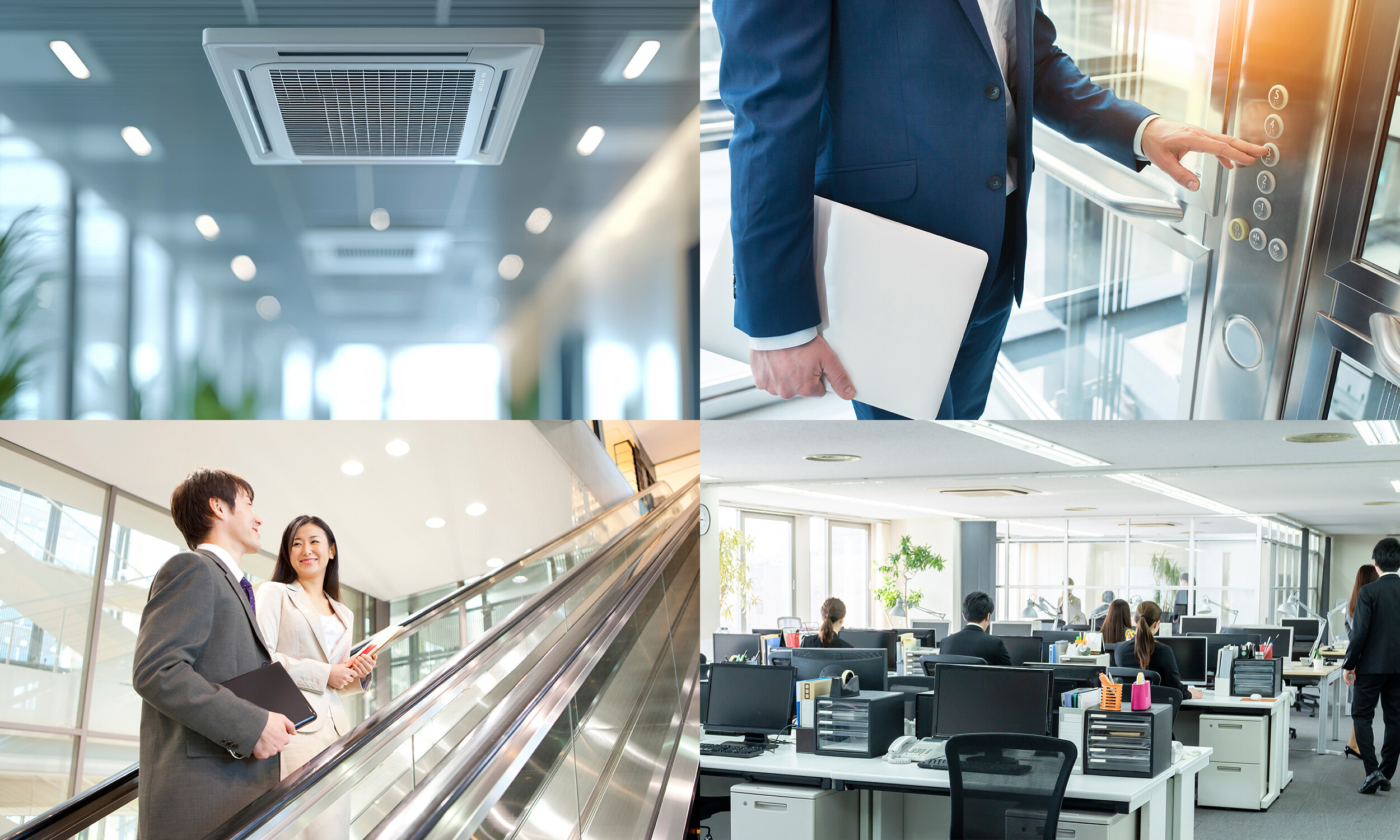 オフィスビルなどの建築物は、完成して実際にテナントが入居して稼働が始まると、大量のエネルギーを消費するようになります。まず、エアコンや換気扇などの空調、そして照明などに電気を使います。エレベーターやエスカレーターなども電気を消費します。