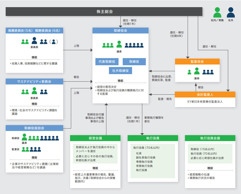 サステナビリティ委員会は、社長を委員長とし、取締役3名、社外取締役2名の計5名で、取締役座談会は、会長を議長とし、取締役4名、社外取締役5名、常勤監査役2名、社外監査役3名の計14名で構成しています。