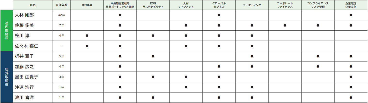 大林組では、大林グループの持続的成長および企業価値向上を実現するために、取締役会の意思決定および監督機能ならびに取締役の執行機能などを発揮するうえで必要なスキル(専門性、経験)を以下のとおり選定し、スキルマトリックスの項目としています。社外取締役については、特に事業進出・撤退にかかる意思決定および監督機能に関するスキルとして、「中長期経営戦略/事業ポートフォリオ戦略」を有することを重視しています。