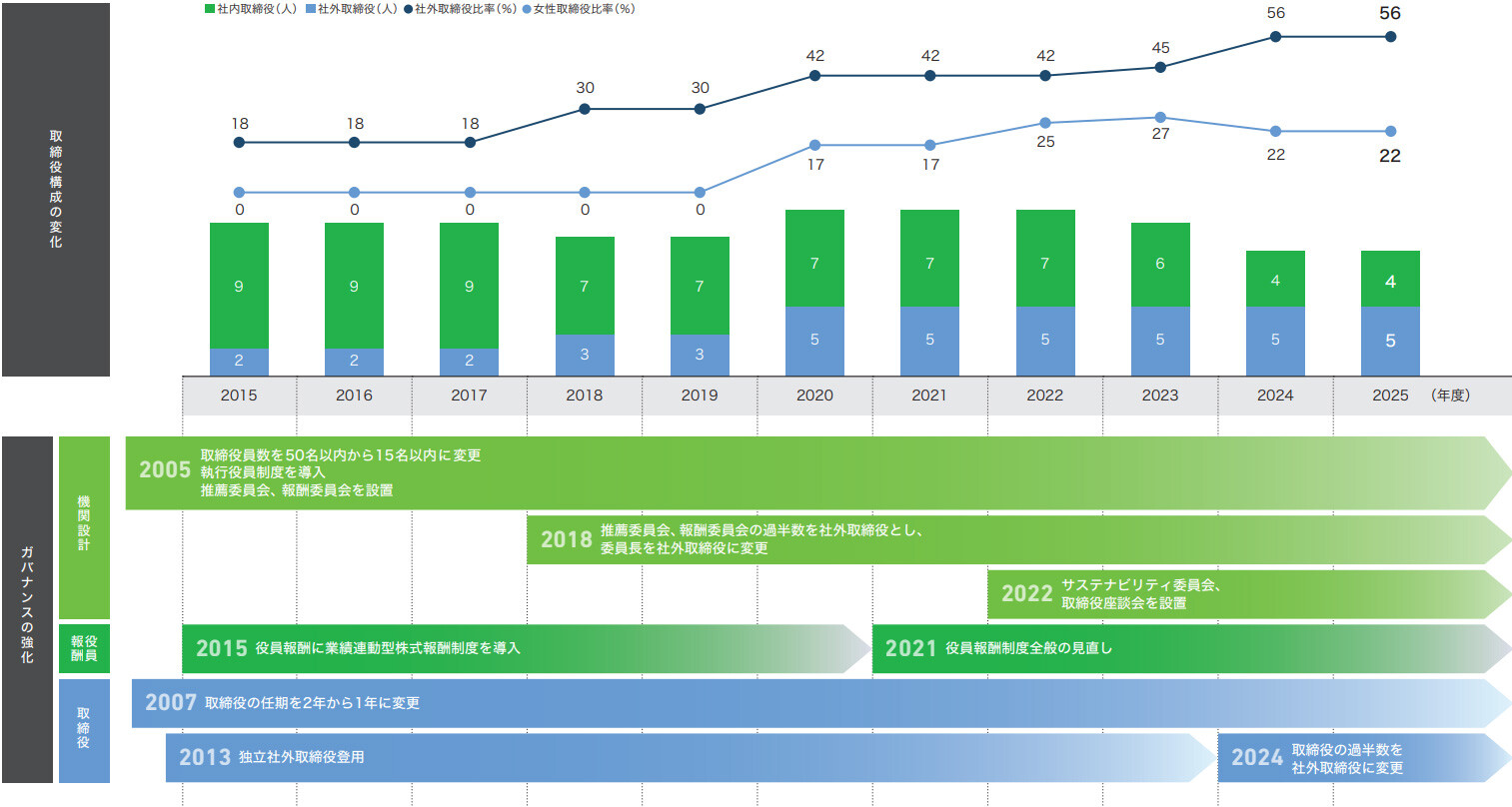 折井 雅子 | サントリーグループにおいて経営に携わった豊富な経験と優れた能力、識見、人格を有しており、当社とは異なる事業領域の企業経営経験者としての視点とESG経営やコンプライアンスに関する豊富な知見などに基づき、当社の経営方針や事業戦略に関する意思決定に重要な助言、提言をいただくとともに、取締役会メンバー、推薦委員会委員長および報酬委員会委員として第三者的な立場から当社のコーポレートガバナンスの運営・監督に寄与いただくことを期待し、社外取締役に選任しています。 社外取締役在任年数:5年 2024年度 取締役会出席状況:15/15回(出席率100%) 推薦委員会出席状況:8/8回(出席率100%) 報酬委員会出席状況:2/2回(出席率100%) 取締役座談会出席状況:11/11回(出席率100%) |