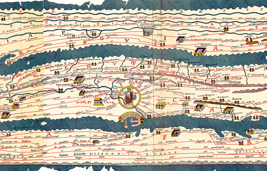 A map of the Roman Empire and its surroundings from around the 4th century, showing Roman roads and cities and inns alongside them, as well as mountain ranges, forests, rivers, etc. The standardized map symbols and the mention of distances between cities, among other elements of the map, suggests that it was used by people to get around. (Length: 6.75 m, Height: 35 cm) Austrian National Library collection