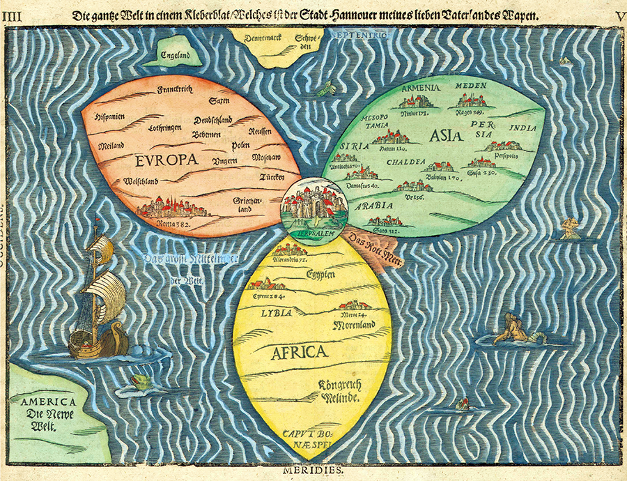 This map, created by German pastor Heinrich BÜNTING, shows three regions of the world (Europe, Asia, and Africa) represented by clover leaves with Jerusalem at their center. It represents a Christian worldview centered on Jerusalem.