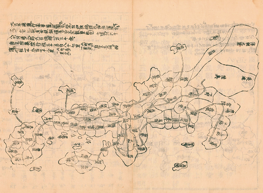 This is an ancient map of Japan. Although it is thought that a monk from the Nara period named GYOKI created this map, no copy of the original map exists at present and its authenticity is unknown. However, this map was used as the prototype for Japanese maps for a long time, and it is believed that all Japanese maps before the appearance of NAGAKUBO Sekisui and INO Tadataka in the mid-Edo period were based on this Gyoki's map.