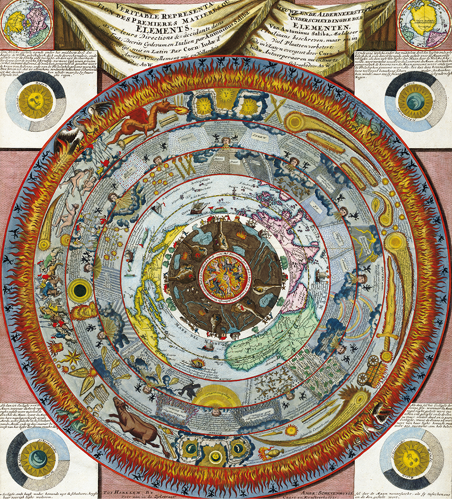 Created by Antonio SALIBA, Maltese cartographer, astronomer, theologian and philosopher. Eight elemental spheres are drawn in concentric circles. Space is at the center followed by the earth's subsurface, surface, map, some natural phenomena and, at the outermost circle, the fire and light of the highest heaven.