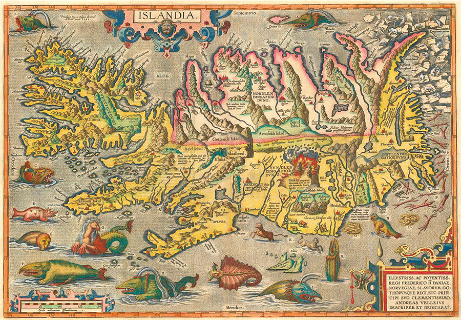 Map of Iceland as depicted in the "Stage of the World" (Theatrum Orbis Terrarum) by ORTELIUS, the world's first modern atlas. It depicts the landscape of the time, including rivers, mountains, fjords, glaciers, and human settlements, as well as the eruption of Mount Hekla and legendary sea monsters.