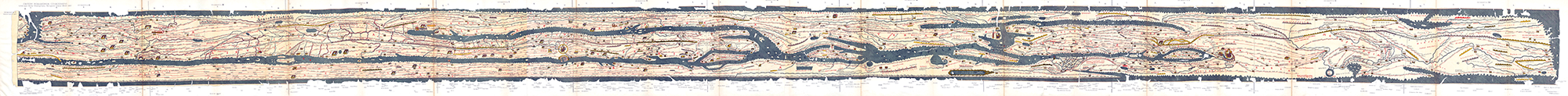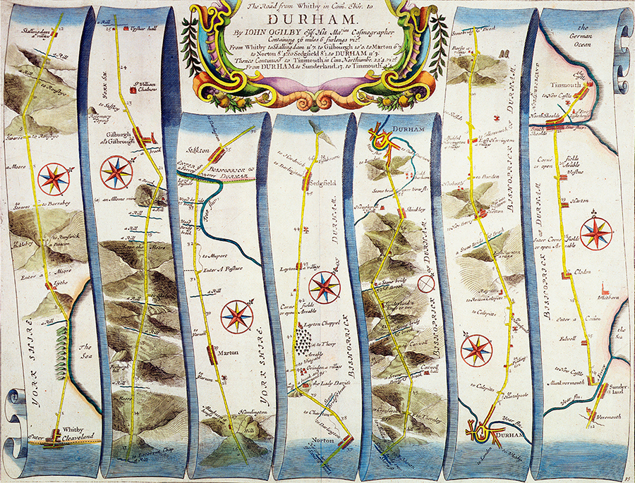 Part of a road map published by Scottish translator John OGILBY. The scroll-shaped map is arranged in strips.