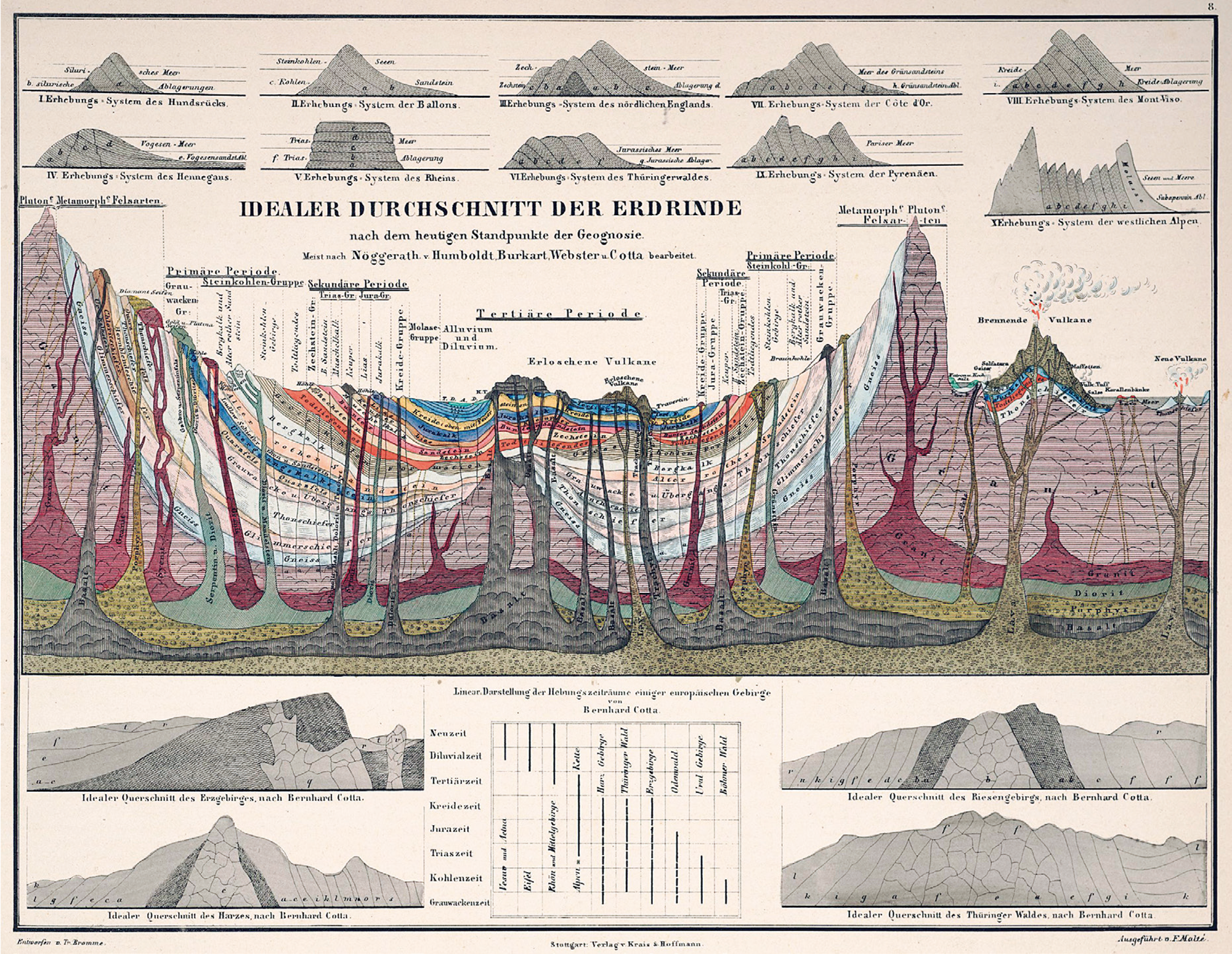 A color-coded plate showing the composition of the earth's crust, published in the work "Cosmos (Kosmos)" by HUMBOLDT, a German geographer who is regarded as the founder of modern geography.