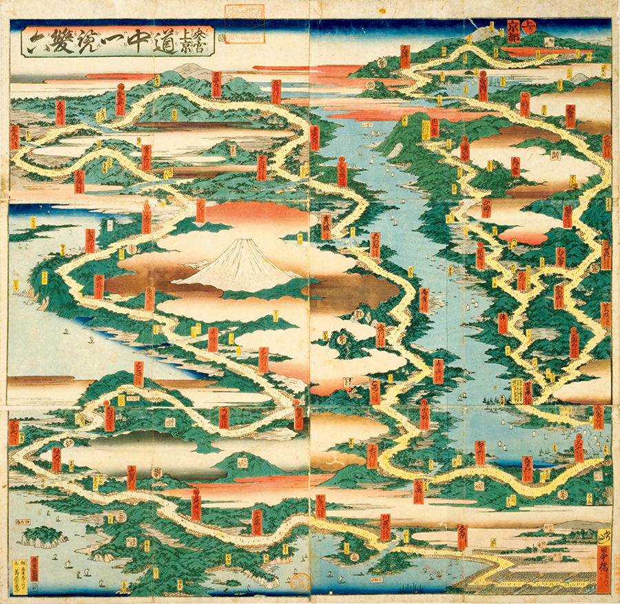 An ukiyoe painting depicting roads and inns in vivid multicolored prints. Not only the inns but also the roads between them are depicted from a bird's eye view, and the topography of the roads and the slopes' variations are skillfully drawn with emphasis.
