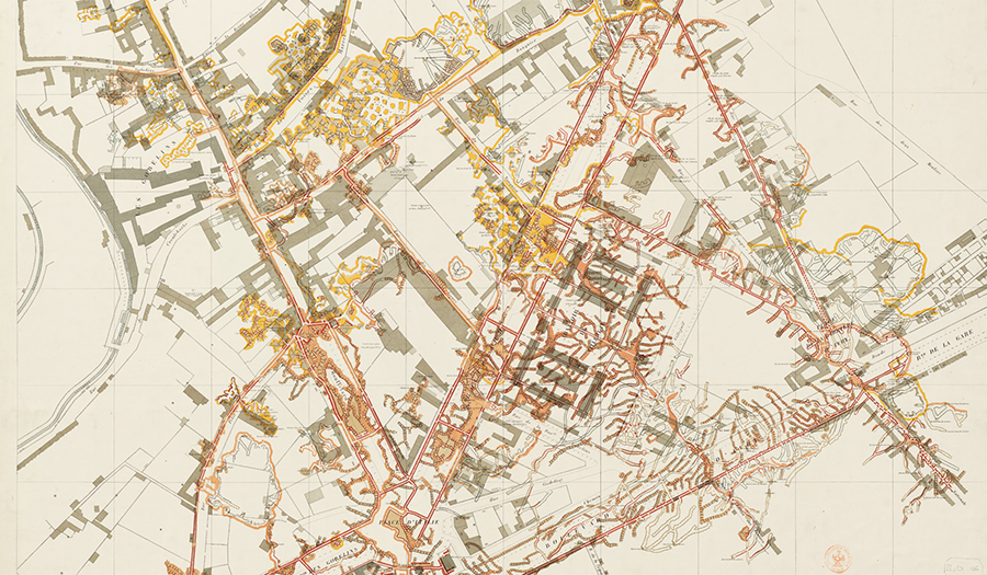 Mankind is not satisfied with simply building above ground but is also expanding usable space by digging underground to create basements, subways, underground malls, and sewers. This fascinating biological behavior is reminiscent of ants building their nests and moles digging underground passages. The figure below shows a map of the underground spaces created in the city of Paris in France in the 19th century. In Paris, stones were mined from underground for use as building materials in construction above ground, and a labyrinth of underground spaces was created as a result of many years of unchecked mining. In the 18th century, these spaces began to be utilized as underground cemeteries as a means of making effective use of them, but a series of cave-ins led to the need for systematic study and management of these underground spaces. Created under these circumstances, this atlas is a very rare map in the history of maps as one that combines underground layers with those above ground. Indeed, this map stirs the imagination of what would happen if we were to create similar maps in a modern city such as Shinjuku or Shibuya, where rows of skyscrapers stand right above underground malls.