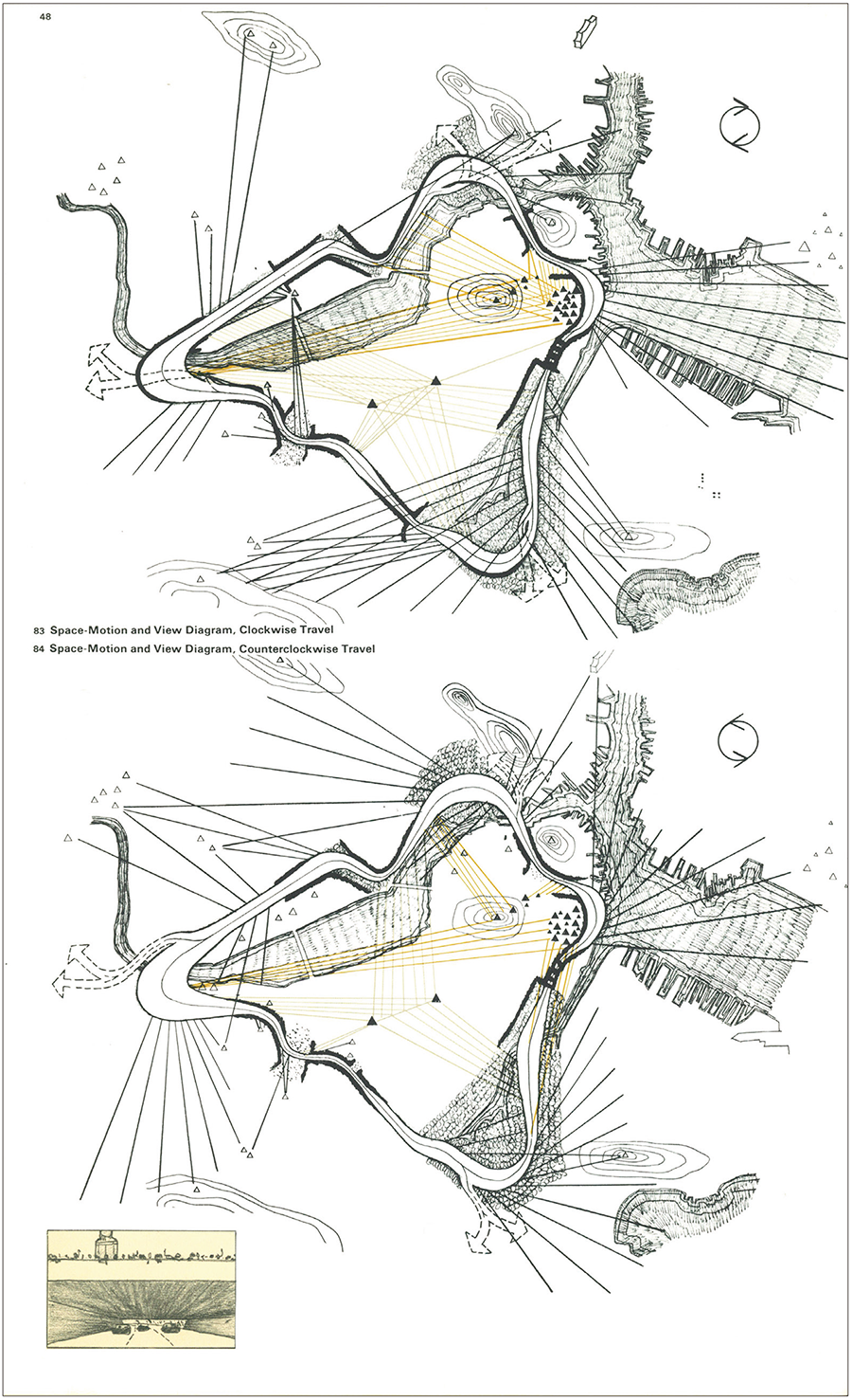 The figure below shows a map created to examine the ideal driving experience on a highway. Kevin Lynch, the urbanist who directed this project, analyzed the landscape as seen from a car driving on Boston's highways and captured through this map the physical sensations created by the relationship between the physical environment and the movement of the car, as well as changes in the view. Radial lines are used to indicate the points of the highway from which the sensations are perceived, including Charles River that flows from the left side of the map to the harbor area on the right, hills that are depicted by contour lines, and skyscrapers on the peninsula that are represented as a group of black triangles. Through this map-based analysis, Lynch sought to capture "the spaces experienced" through the mutual interaction between the subject in motion and the physical environment. There exist as many forms of the world as there are subjects living in it. This is the map that provided this fresh insight.