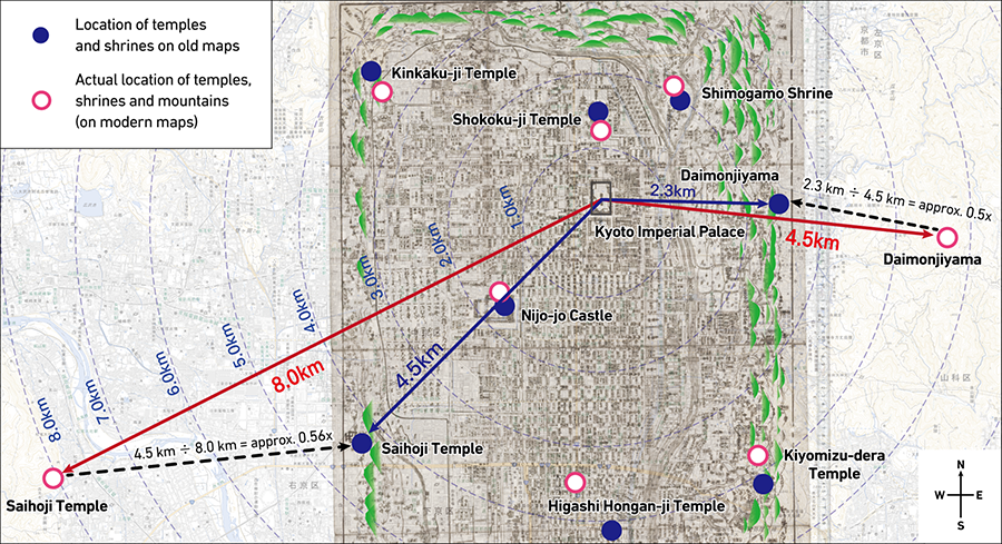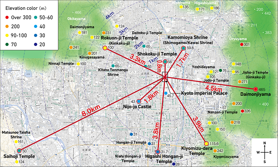 [Actual distances from Kyoto Imperial Palace to major temples, shrines and mountains (○) and their heights]