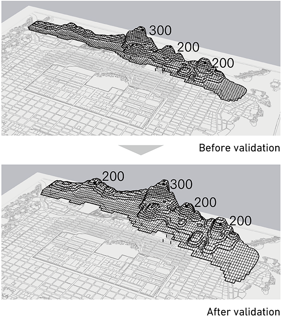 It was found that in old maps of Kyoto, even though the city center was drawn almost to scale, distances to the surrounding mountains and paths in the mountains were drawn with a ratio of one unit in the map's longitudinal direction for every half-unit in the latitudinal direction. If one were to attempt a three-dimensional rendering of the mountains based on the planar geometry of the old maps of Kyoto and the elevation of the mountains which would not have changed from the past to the present, the mountains would appear to be extremely steep. In creating 3D renderings of the Hashihara Castle Town Map, the height of the mountains was assumed to be around 200 to 300 meters by using the elevation of mountains in Kyoto as reference, and it was found that doubling the background distance of the mountains across the entire range in which they were drawn resulted in a natural shape for the mountains.