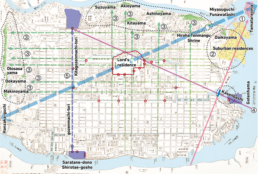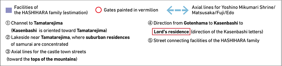 It is conceivable from ④ that Gotenhama served as a facility for holding banquets while enjoying views of the imperial palace over Kasenbashi. It is believed that the existence of these townscape axes is an indication of the importance Norinaga had placed on the visual relationship between the town and the surrounding mountains and scenic spots. With regard to ⑤, the facilities with vermilion gates (a site that appeared to be a facility of the HASHIHARA family on the mountain side [purple] and Koshu-den [Shirotae-gosho] on the waterfront side) were connected to each other. On the waterfront side, there were moats with bridges, storehouses, and docks, and in the middle of the axial line, there was a series of vermilion gates connecting the citadel area with the exterior.