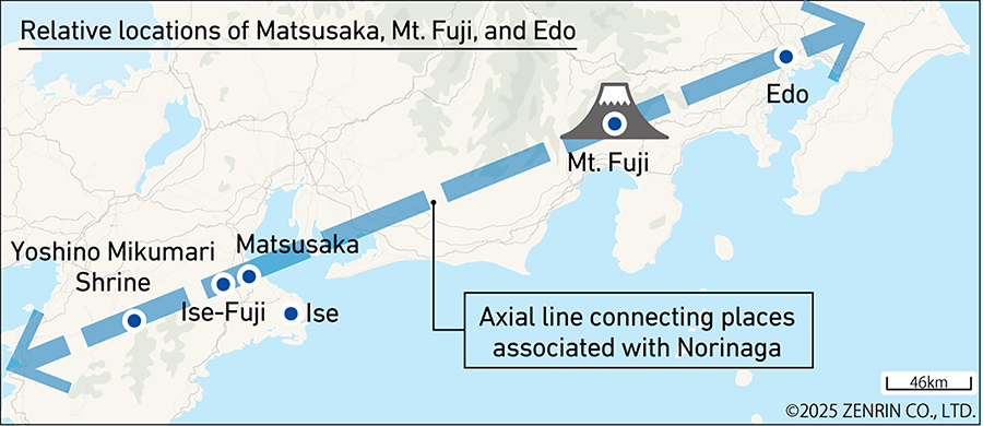 In the course of imagining the scenery envisioned by Norinaga, the project team superimposed this axial line onto the map of Japan. When placing the start of the axis at Norinaga's hometown of Matsusaka and extending it eastward, the axis formed a straight line that passed through Mt. Fuji and led to Edo. Conversely, extending the axis westward created an axial line that ran into Ise-Fuji and led to Yoshino Mikumari Shrine in Nara beyond that. In other words, if the axial line from the scenic spot Tamatarejima to the imperial palace was extended all the way to the west, it would create exactly the same angle as the direction from Matsusaka to Ise-Fuji or an axial line from Matsusaka toward Mt. Fuji and to Edo beyond that.