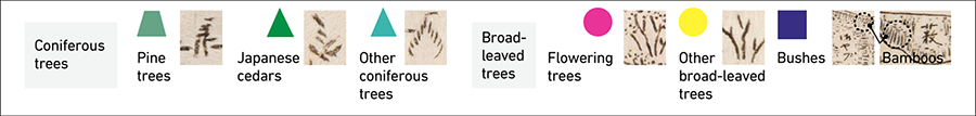 There were also some spots where pictures were annotated with words, such as "cherry blossom forest." To give further weight to these conjectures, the team conducted a comparative review using historical documents from the same period, such as Rakuchu Rakugai Zu and the Meisho Zue of the Edo period, to figure out the species of trees depicted on the map. The trees were also color-coded according to their species.
