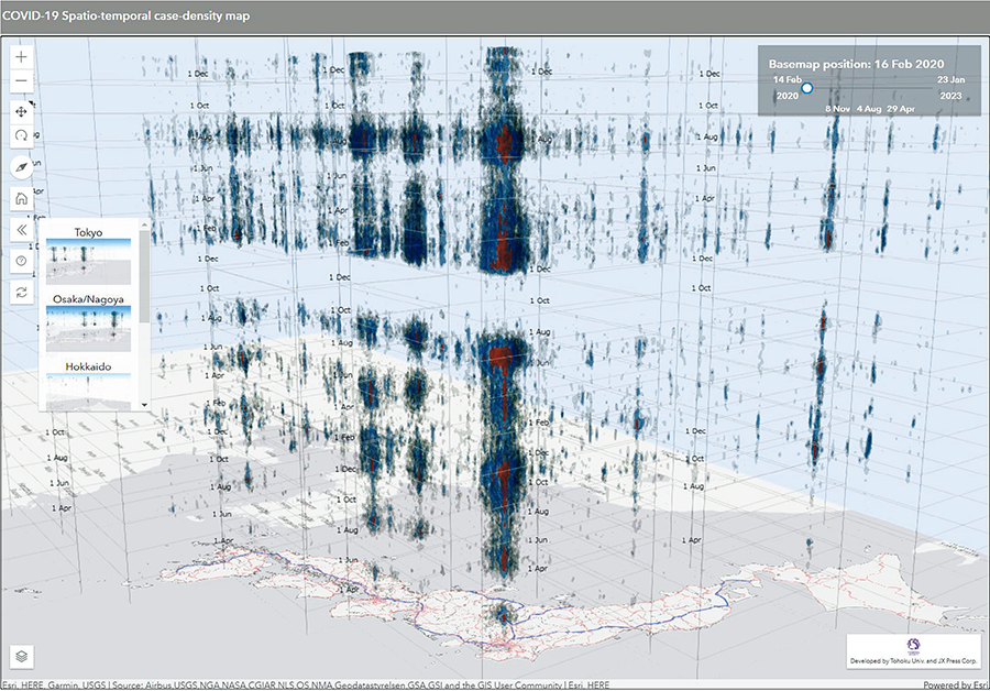 Spatiotemporal 3D maps created by adding a time axis to such maps can now be easily made using GIS. The figure below, which applies this to the state of transmission of COVID-19, plots the number of infected persons on spatiotemporal coordinates using data on the location and date of reported COVID-19 cases, converts this information to density, and represents it as a cloud-like mass.