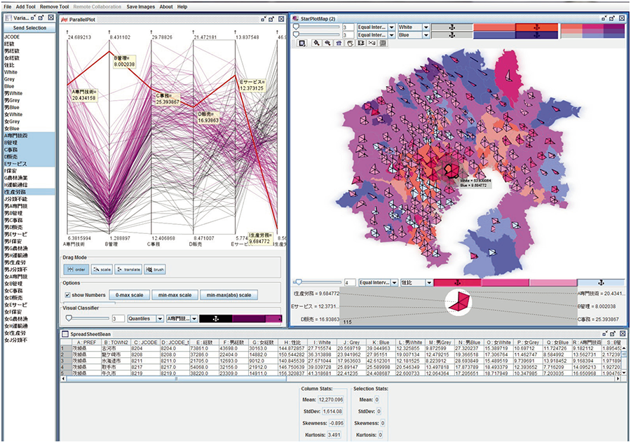 Although the digitalization of geospatial information may increase the opportunities to utilize such information without representing it as maps, the skill of reading maps as visual representations will basically remain the same as in the analog era. However, map reading may become easier depending on the design of the user interface for retrieving information helpful for reading the map. In fact, geographic visualization tools have been developed to represent various geospatial information in an aggregated manner on a single map and for reading information in an exploratory manner. For example, the figure below illustrates an exploratory analysis of the relationships between various population data items for the Tokyo metropolitan area using the GeoViz Toolkit developed by The Pennsylvania State University. Combining not only maps but also graphs and other graphical modes of representation can serve to capture information hidden in the data from multiple perspectives.