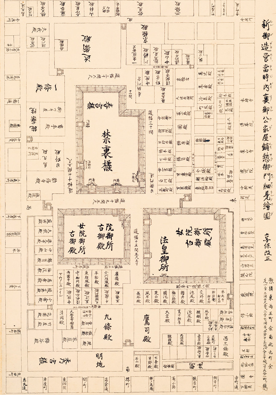 Another point of interest is the five imperial palace floor plans, including Imperial Palace Map (kyujo sashizu), at the end of the Shokugensho Shiryu. In addition to his interest in the Kyoto Imperial Palace, his drawing techniques and penmanship in these drawings were also reflected in [Kyoho Reforms] Detailed Map of the Buildings and Gates of the Imperial Palace at the Time of New Construction ([kyoho kaisei] shin gozoei toji dairi onkuge yashiki so gomon saiken no ezu) (photo), which is believed to have been created around the same time, as well as in Map of the Four Seas under the Heavens of Japan (dainihon tenka shikai gazu), a major work produced when he was 17, and further in Hashihara Castle Town Map.