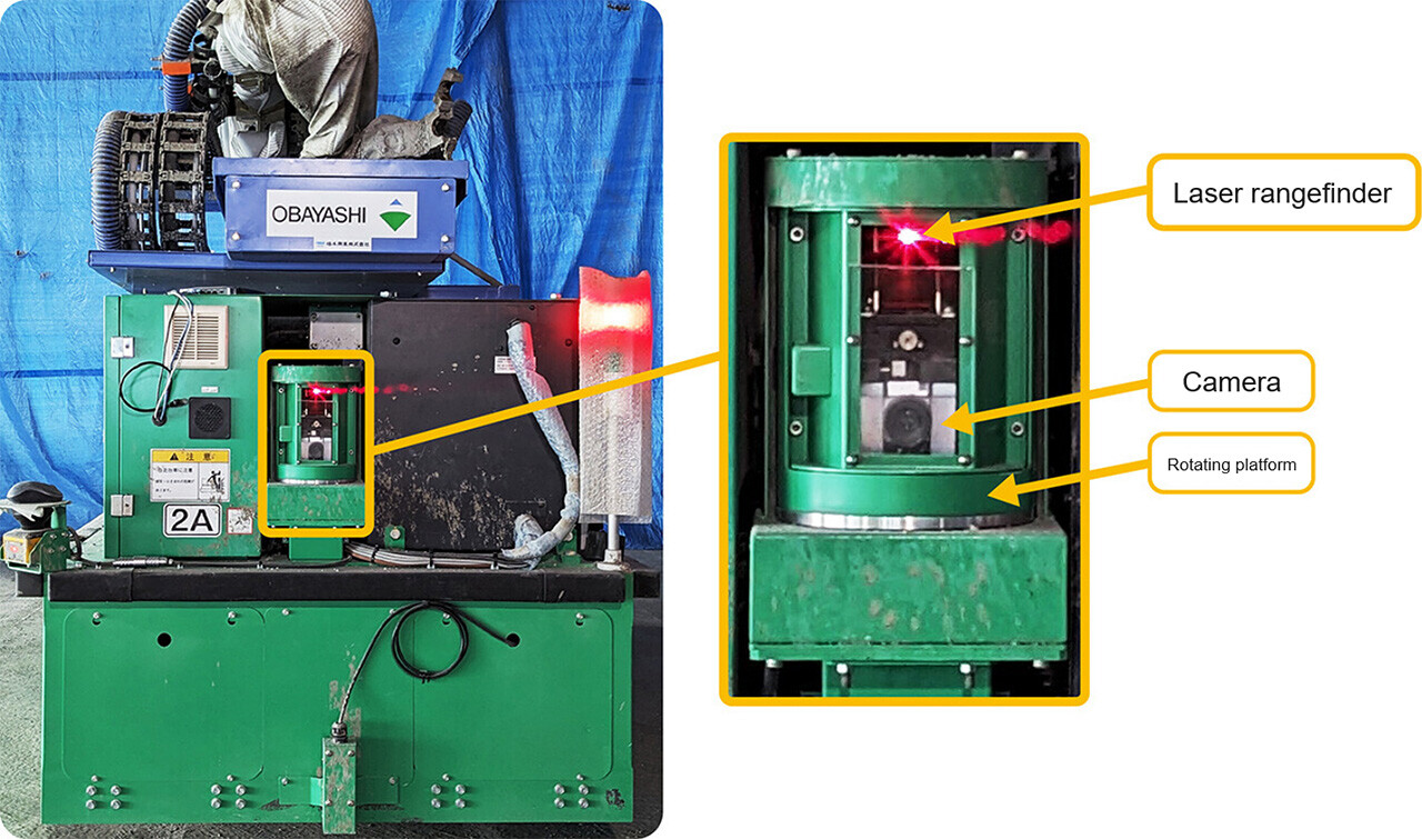 The fireproof coating spray robot is equipped with an autonomous movement function that enables it to follow pre-registered task data to move around a work area on site, stop at a pre-determined spraying position, and start the spraying process. The second-generation model achieves more accurate autonomous movement by using the resection method(*2) employed in land surveying for determining positioning.