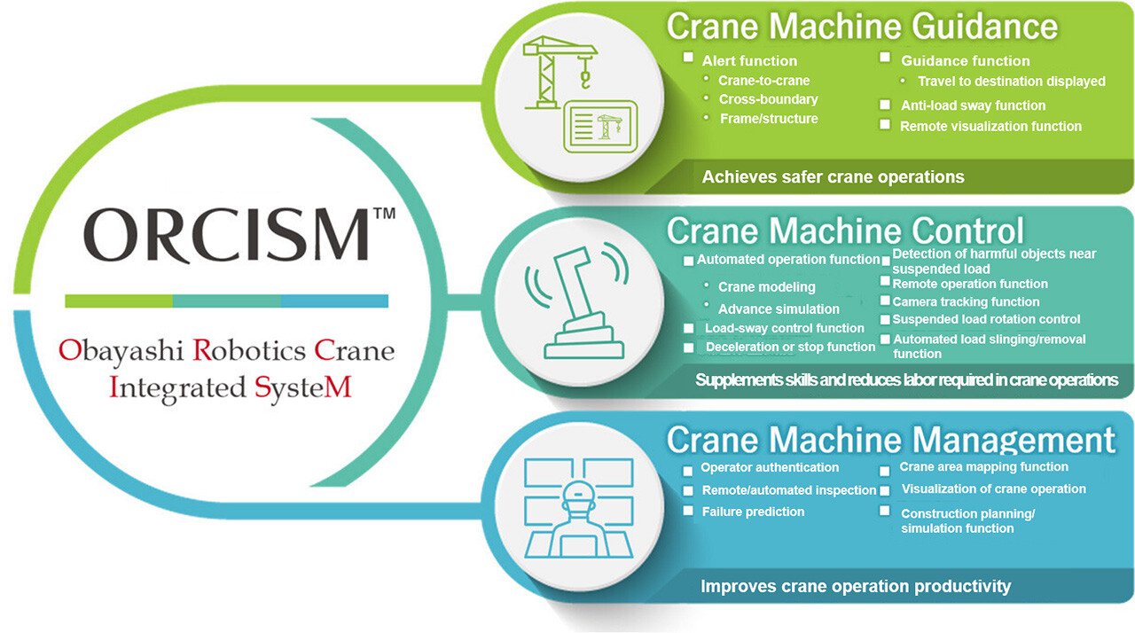 ORCISM comprises the three functions required for crane work: crane machine guidance (operational support functions for ensuring safety), crane machine control (remote and automated operation functions that reduce labor required and supplement skills), and crane machine management (functions that improve productivity and ensure security). These three functions can be integrated and managed on a digital twin to detect any obstructions in the vicinity of a crane and issue alerts in the physical space. The digital twin can also consistently monitor a crane's load sway and decelerate or stop the machine in the physical space as necessary.