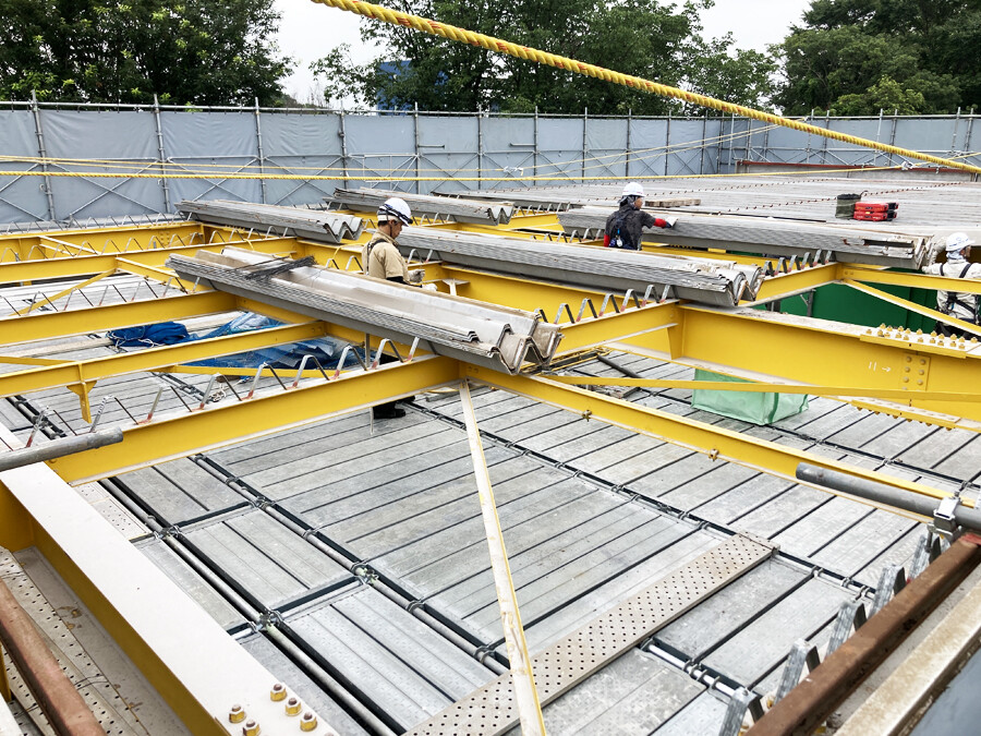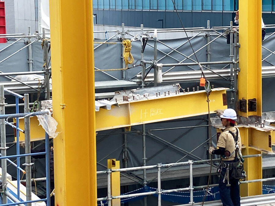 The concrete removed from the existing building was temporarily transported to a material storage site adjacent to the demolished building, while the steel structural components were transported to a frame fabrication factory, where the steel structural components were reprocessed for use as the skeleton of the new building inspected to confirm any damage or deterioration, as well as measured the external dimensions. By temporarily removing the components outside the site, we also conducted verification for potential reuse in other sites as part of future plans.