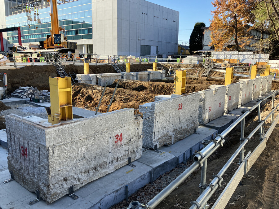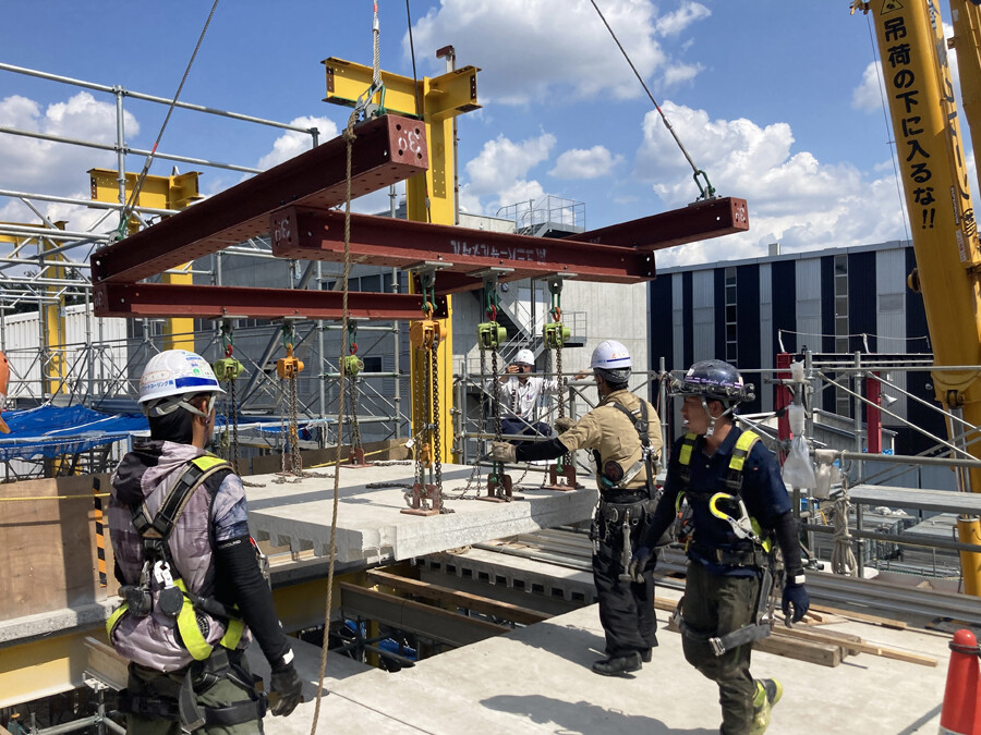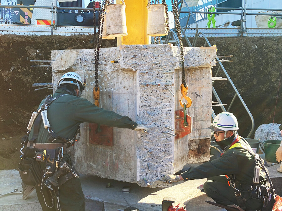 For used concrete foundation, foundation beams, and slabs, we ensured installation accuracy and made minor adjustments to joints as the same as the precast components, and then casted new concrete at the edges to be joined to suit the planar shape of the new building.