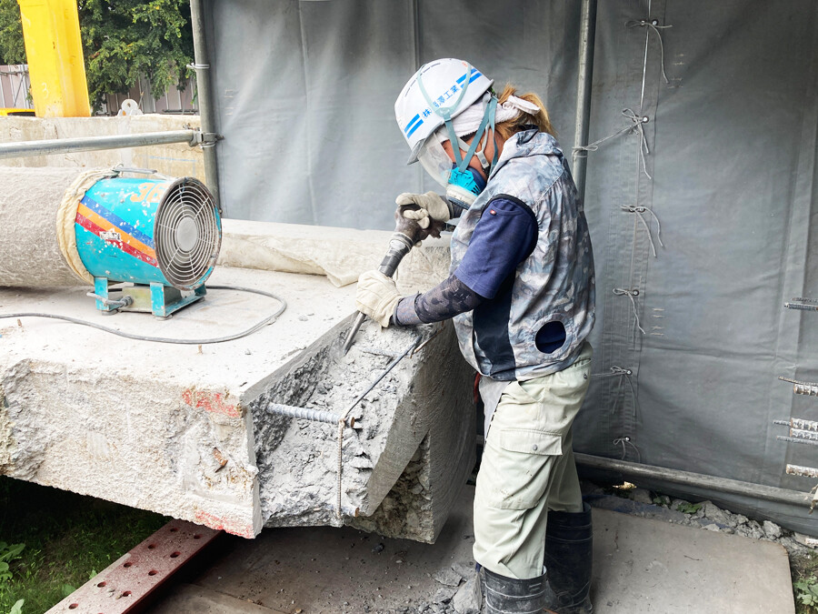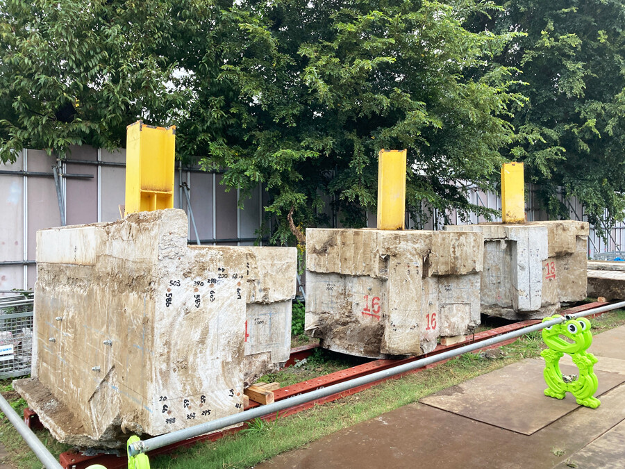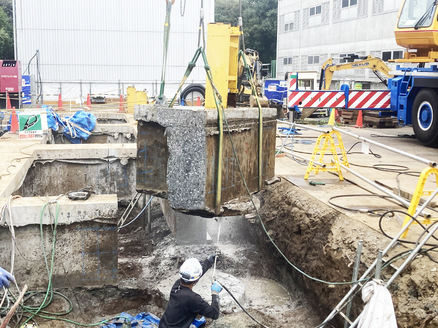 We directly verified the condition of the structural components of the existing building (Electromagnetic Engineering Laboratory) being demolished at Technology Research Institute and confirmed the most of them were reusable. To keep these components reusable from the demolished building, we carried out the work with the utmost care, considering the cutting positions and the weight distribution during transportation.