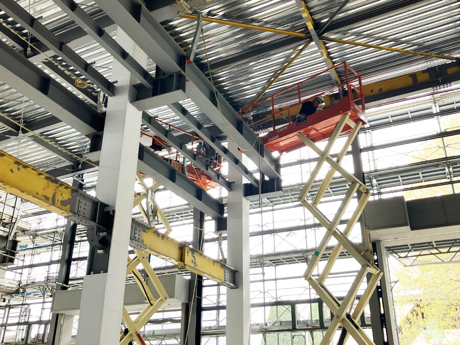 Structural components reused from the demolished building are almost indistinguishable from new materials in appearance, which makes them difficult to identify after completion. To ensure they can be identified we applied red paint to the used steel structural components to improve visibility.