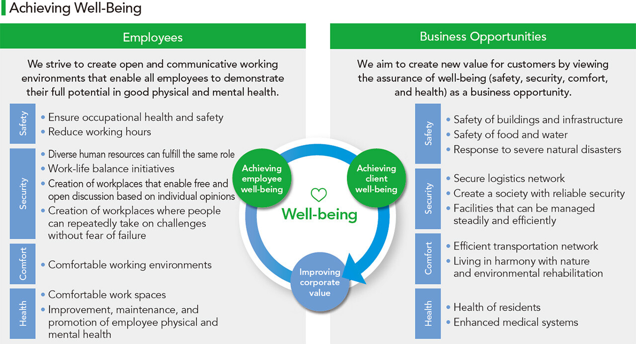 The Obayashi Group believes that it is important to achieve well-being as well as to enhance employee engagement to maximize the performance of individuals and organizations. We also believe that providing growth opportunities and encouraging job satisfaction among employees will ultimately generate greater well-being for its customers, so it is committed to the tandem pursuit of employee well-being and broader well-being as it pertains to potential business opportunities.