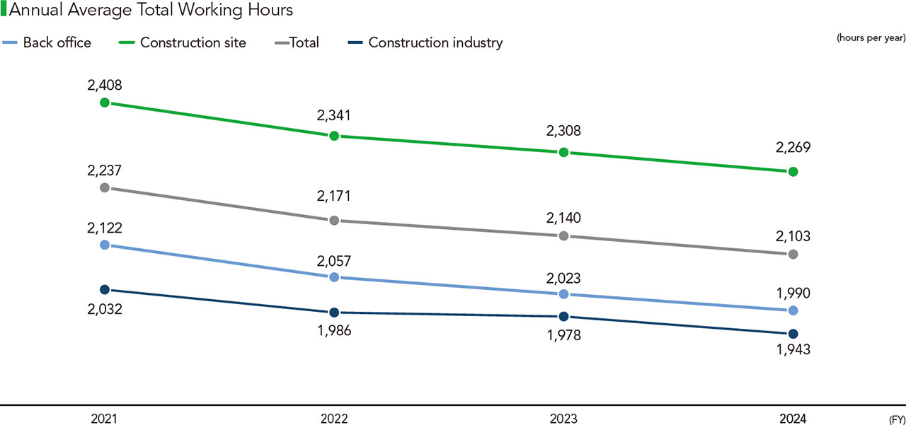The Obayashi Group believes that, in order for each employee to maximize their abilities, it is important to maintain good physical and mental health, to respect their peers, and to be able to engage in constructive discussion based on trust. We seek to further strengthen and invigorate our organizational capabilities by creating healthy, comfortable, and open working environments.