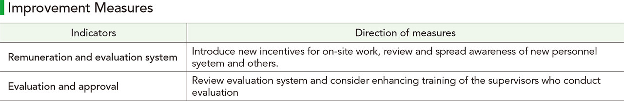 On the other hand, the scores for remuneration and evaluation system, and evaluation and approval remained relatively low, pinpointing some room for improvement in the personnel system and management areas. The management team takes the survey results extremely seriously, clearly recognizes any organizational issues, and steadily incorporates the results into improvement measures.