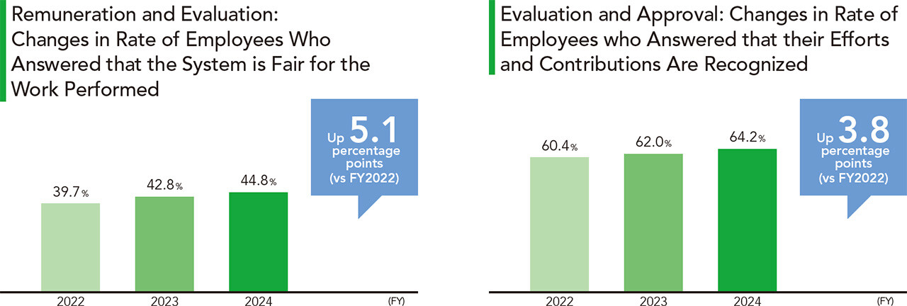 The score for the indicator under remuneration and evaluation system, "You feel that your organization' s remuneration policy and evaluation system is fair and appropriate for the work performed" improved by 5.1 percentage points from 39.7% in FY2022 to 44.8% in FY2024. This is the largest margin of improvement among all the indicators.
