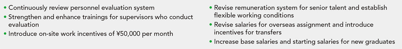 In April 2023, Obayashi significantly revised the annual salary level for senior workers appointed to such positions as managers with important responsibilities at construction sites, and in April 2024 we also applied the same revision to senior back office employees. In this and other ways, the Company actively promotes measures to enhance employee engagement.
