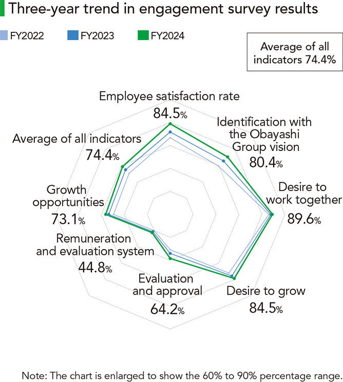 The Obayashi Group believes that it is essential to maximize the performance of individuals and organizations for sustainable growth. We also believe that strong engagement fosters positive organizational activity, and as such the Obayashi Group Human Resource Management Policy seeks to promote the development of personnel who identify with the Company' s vision and are driven to seize opportunities and collaborate with others to achieve their full potential as highly engaged, ideal human resources. We conduct engagement surveys of all employees, identify issues, and work to resolve them.