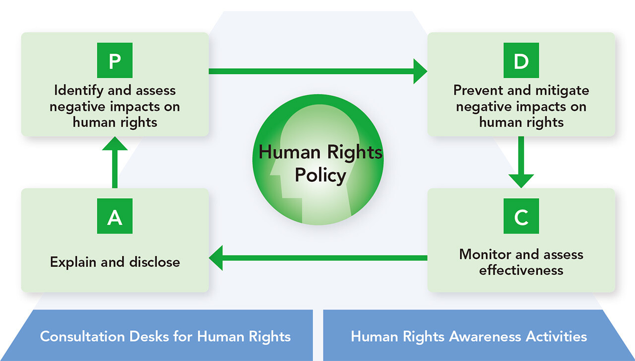 Based on the United Nations Guiding Principles on Business and Human Rights, we operate a PDCA cycle on human rights: identifying and assessing negative impact, preventing and mitigating negative impact, monitoring, and disclosing information and providing explanations.