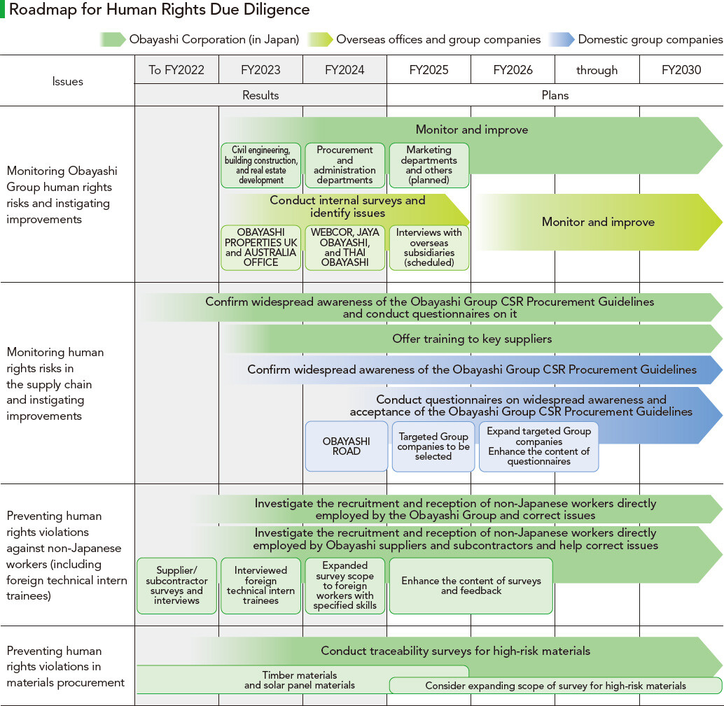 FY2023 | ・Expanded initiatives to Group companies in Japan (Confirmed widespread awareness of the Obayashi Group CSR Procurement Guidelines and conducted a survey on the employment status of foreign workers and foreign technical intern trainees and interviews). ・Monitoring of human rights risks in key business divisions (Civil Engineering, Building Construction, Real Estate). |