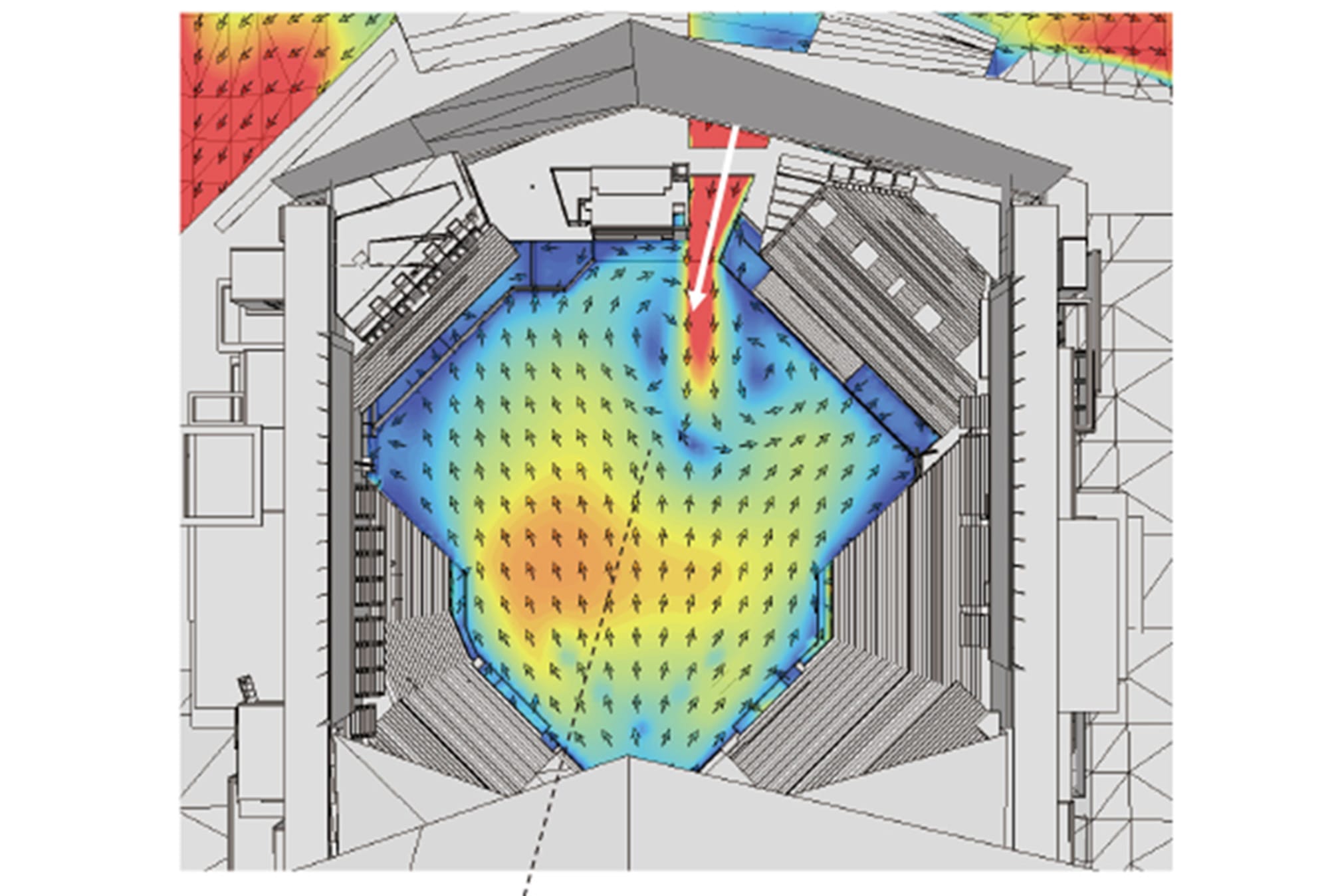A wind tunnel at the base of the glass wall admits natural wind; simulations identified circulation suited to turf growth.