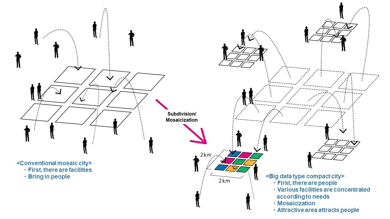 Mosaic City is a futuristic city that is spatially and functionally optimized according to regional characteristics, residents' intentions and needs, and planning challenges by utilizing big data. It can also be called a super compact city, created by using the empty urban space caused by population decline and other factors to create a mosaic of life-related facilities (government offices, offices, schools, hospitals, shops, and others) that individual residents need.