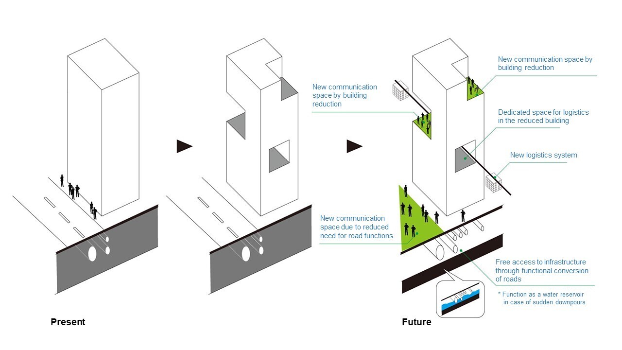 Currently, most buildings have a single function (offices, shops, hospitals, residences, etc.), but the central axis of this concept is the reconfiguration of the functions of existing buildings.