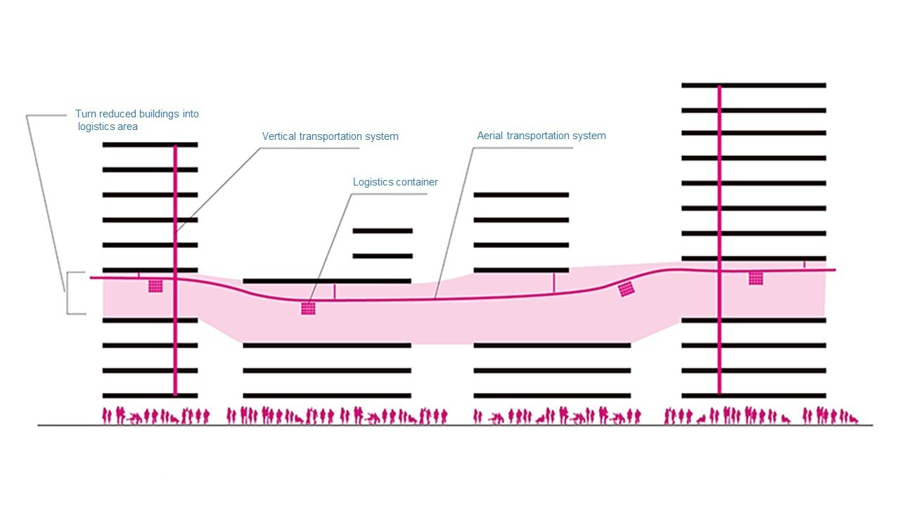 Although there is an idea to move the entire new logistics system underground, an aerial transportation system (ropeway) using carbon nanotube cables will be used to take advantage of the space created by measures such as building reduction.