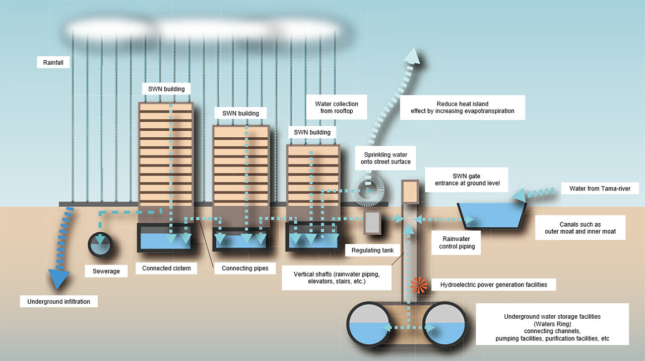 While Tokyo is fortunate to experience abundant precipitation, the city must also prepare for torrential rains and other downpours that see large amounts of rainfall in a short period of time. Tokyo needs a future-oriented system such as the Smart Water Network--, a huge mechanism for storing and circulating rainwater and controlling water flows.