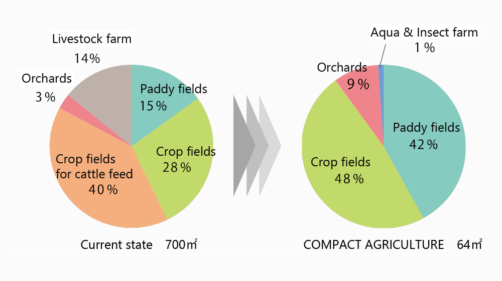 The concept behind Compact Agriculture is to efficiently produce agricultural products of optimal quality and quantity in little surface area. Based on the collected data, including citizens' height & weight, past illnesses, health status, food texture and taste preferences, and event schedules, produce will be provided at the right time and in exactly the amount needed.