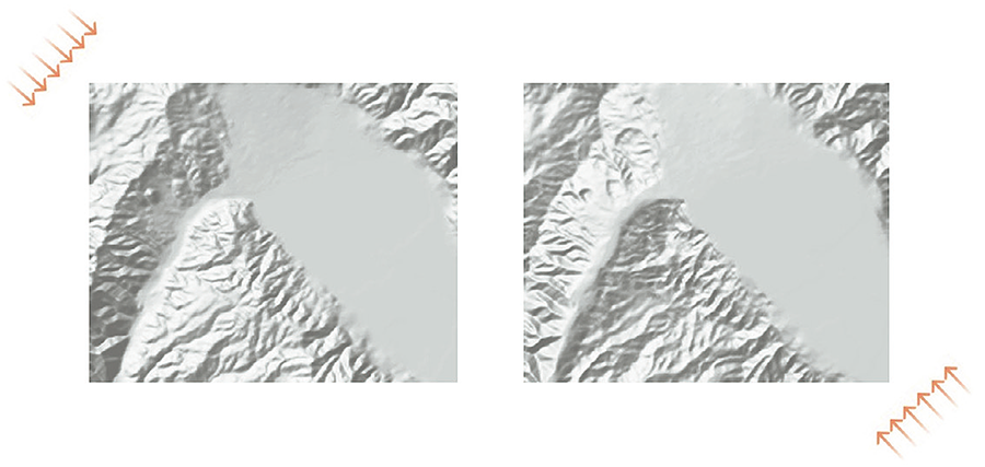 同じ数値標高地形モデルに対して左図は左上から右下へ、右図は右下から左上に光線を照射したもの。各々の図の左手の尾根筋と谷筋が逆転して見えるであろう。衛星画像でも同様な現象が生じることがある。