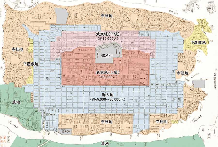 町人地では、通り名以外の表記がなく、空白になっている。当時の地図では町人地の詳細を細かく書かないことが一般的であった。