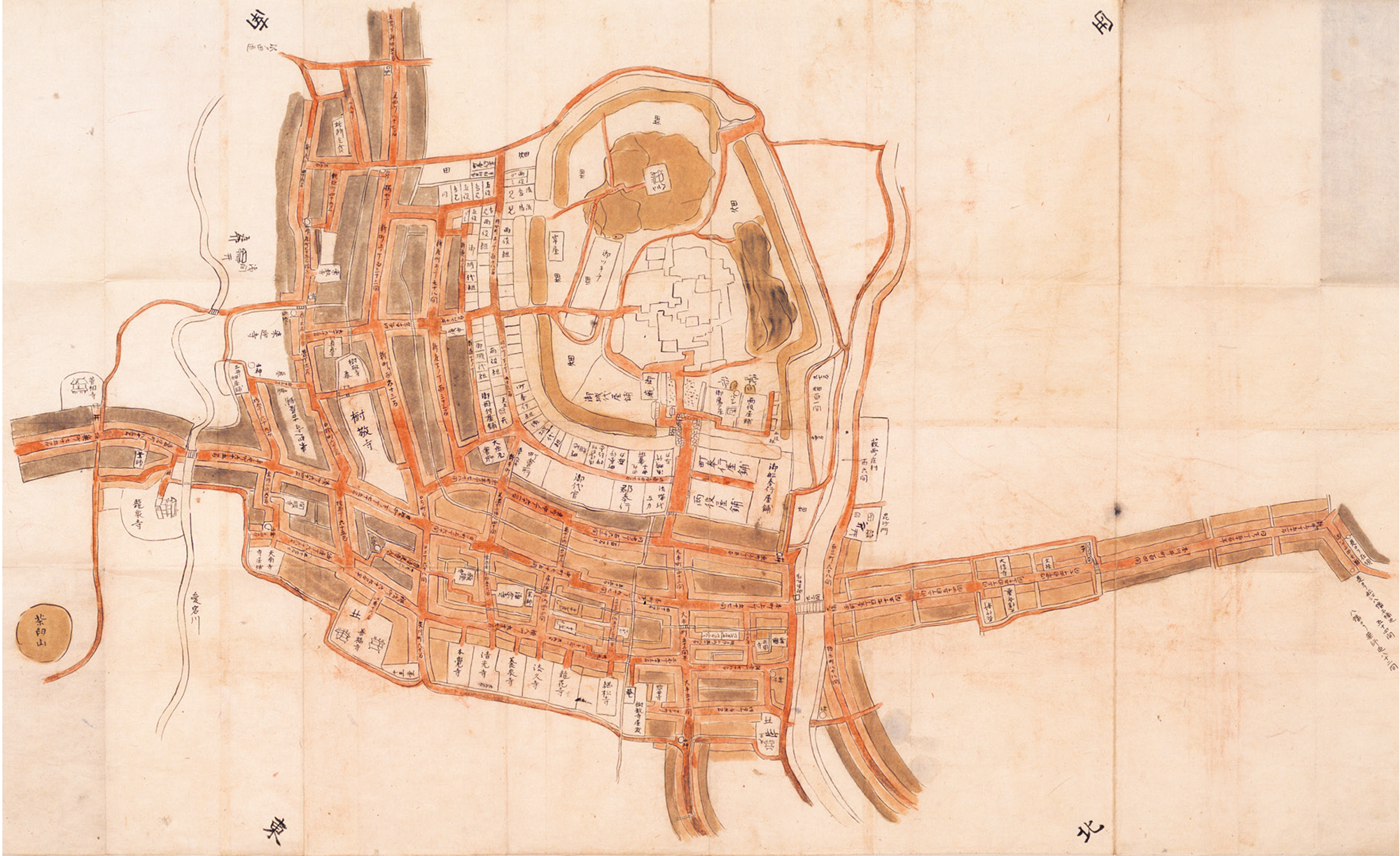 まず一見して気づくのが、城主が居住する「御所中」を中心に、市街地全体が武家地、町人地、寺社地、さらに郊外の農地など、機能ごとに明確に描き分けられている点である。