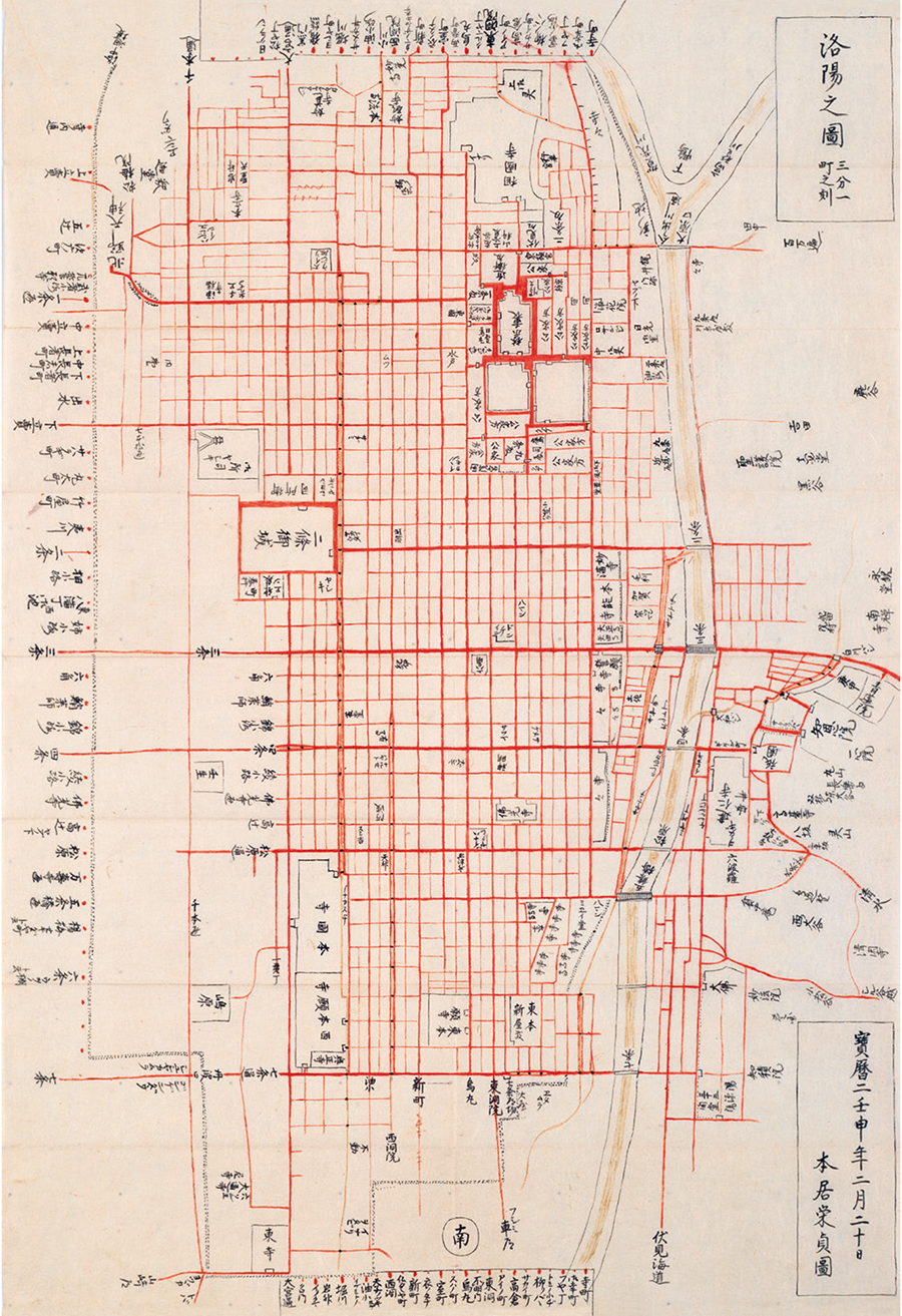 また、当時の京都図などは縦と横でスケールが異なり、本来正方形の街区が長方形に描かれたり、通りの名前が書かれていないこともあったが、「端原氏城下絵図」のスケールは縦と横が同一で、すべての通りの名前が書かれているため、当時の京都図などと比べ、正確に都市を表現した地図であると言える。