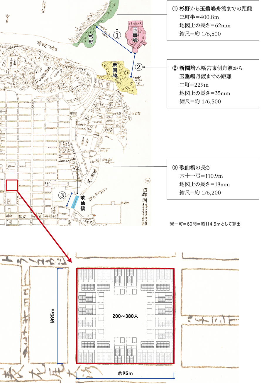 【縮尺の検討と町屋配置図】