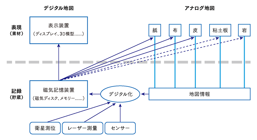 こうしてデジタル化が地図にもたらした変化を端的にいえば、表現形態と情報内容の分離にある。つまりアナログ時代の地図は、素材ごとに表現と情報が一体となっていて不可分な関係にあったが、デジタル化によって情報はコンピュータのメモリーにほぼ無限に貯蔵でき、それを様々な形態の地図に表現できるようになったのである。こうして分離された地理空間情報を処理するGIS(地理情報システム)が登場し、同じ情報から地図だけでなく多種多様な表現が選択できるようになった。さらに地図はインターネットに媒介されることで作成者と利用者の範囲が拡大し、情報の共有も促進された。