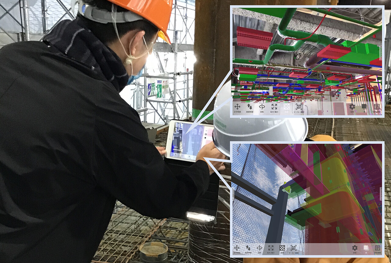 holonicaは検査モードからビューモードに設定を切り替えることで、さまざまな施工管理に利用可能です。例えば、コンクリートの打設前の現場に打設後のBIMデータ(躯体モデル)を重ね合わせることにより、スリーブや開口の位置・個数などを確認できます。また天井インサートの配置や汚染土掘削時の墨出し、さらに鉄骨製品検査や起工式などで発注者や設計・監理者とともに完成イメージの確認が図れるなど、建設現場を幅広くサポートするシステムとなっています。
