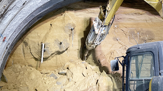 芝山トンネルは、圏央道の千葉県内で、町道、ゴルフ場、農業用水管などの直下にあります。地質は未固結砂質土(砂を主成分とし、粒子同士が固まっていない状態の土)が主であるため、流砂現象による地山崩壊や、吹き付けコンクリートの付着不良、地表面沈下の発生などの恐れがありました。